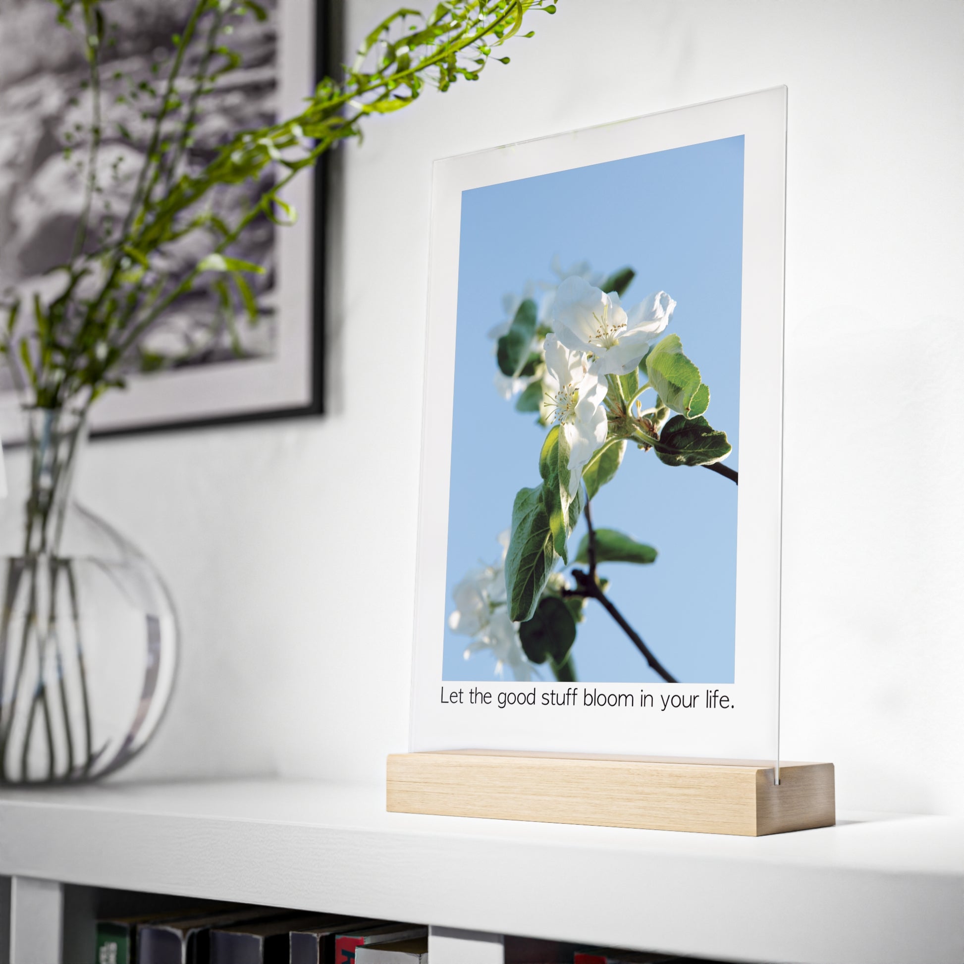 Acrylic Sign "Let the good stuff bloom in your life.“ - Elegant and inspiring art piece with Photograph „Apfelblüte/Apple Blossom“ by Sarah Buhl